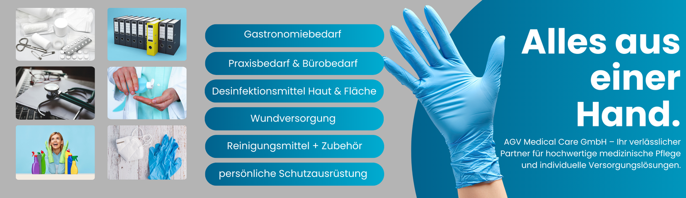 Herzlich willkommen bei AGV Medicalcare - Ihrem vertrauenswürdigen Online Sanitätshaus! Wir verstehen, wie wichtig es ist, die richtigen Hilfsmittel zur Unterstützung Ihrer Gesundheit und Ihres Wohlbefindens zu haben. In unserem vielseitigen Angebot finden Sie alles von medizinischen Geräten über Pflegehilfsmittel bis hin zu therapeutischen Produkten. Sie können bequem von zu Hause aus stöbern und bestellen, während Sie sicher sein können, dass alle unsere Produkte die höchsten Qualitätsstandards erfüllen. Ihre Gesundheit liegt uns am Herzen, und wir sind hier, um Sie auf Ihrem Weg zu unterstützen. Unser umfangreiches Sortiment und die hochwertigen Produkte bei einer schnellen Lieferung sorgen dafür Ihr Wohlbefinden zu steigern. Unsere Pflegprodukte, Hilfsmittel und weitere hochwertige Produkte rund um die Gesundheit sind unser Beitrag für Sie, um Ihren Alltag mit Sicherheit gesünder und besser gestalten zu können. Wir bieten unter anderem folgende beliebte Marken und namhafte Hersteller an:Paul Hartmann, Fresenius Kabi, Schülke, Intco, Braun und viele weitere Marken.