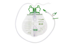 Bettbeutel mit transparenter und belüfteter Tropfkammer, Rücklaufsperre, Probenentnahme am Stufenkegel, bakteriendichtem Belüftungsfilter, Antirefluxventil, T-Ablasshahn mit Einstecklasche, Schiebe- und Lakenklemme, Befestigung des Beutels mit Kunststoffbügel oder Kordel, steril, Tragedauer: bis zu 14 Tage, Volumen: 2.000 ml, Schlauch: 120 cm, innen profiliert.