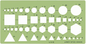 Bestellen Sie jetzt und verbessern Sie Ihr Büro mit LINEX 1270S Kombinationsschablone mit Kreisen, Quadraten, Sechsecken und Dreiecken von 3-24 mm, Tuschenoppen, 195 x 100 mm!